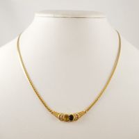 Collier en or 750 mil. à motif central serti de deux saphirs ovales dont un jaune et de diamants brillantés (longueur : 40 cm environ). 9,8 g. brut