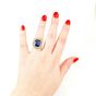 Bague pompadour en or 750 mil. et argent 800 mil. centrée d’une pierre bleue imitation dans un entourage de roses. (TDD : 53). (Légère déformation, pierres cassées). 4,9 g. brut