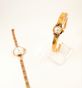 Bracelet-montre de dame DENCO en or 750 mil., boîtier rond, cadran blanc à index et chiffres arabes, lunettes rehaussées de pierres rouges imitation, mouvement mécanique, sur bracelet rigide en or 750 mil. (diamètre : 18 mm) (Tour de poignet : 15 cm). (Egrisures). On y joint un bracelet-montre de dame A. ERICSSON en or 585 mil. mouvement quartz, sur bracelet en or 585 mil. (diamètre : 25 mm) (longueur : 17,5 cm). Poids total brut : 44,7 g. brut