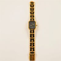 CHANEL Swiss made n°X.H.14128. Montre « Première » plaqué or, cadran noir 20mm, mouvement quartz, bracelet double rang de chaînes entrelacée de cuir agneau noir. T.M. Bon état (légères rayures, petit éclat à la glace).