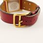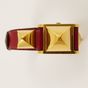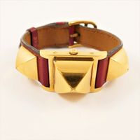 HERMES Paris Swiss made n°561025. Montre « Médor », cadran blanc 18mm, mouvement quartz, bracelet en cuir Courchevel rouge clouté. Longueur : 18cm. Bon état (usures, traces).