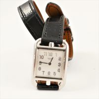 (*) HERMES Paris Swiss made n°CC1.210/2699535. Montre « Cape Cod » en acier, cadran blanc 22mm, chiffres arabes, aiguilles et index luminescents, mouvement quartz, bracelet double tour en cuir noir. Très bon état (légères usures).