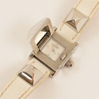 HERMES Paris Swiss made n°ME2.110/2593735. Montre « Medor II » en acier, motifs clous dont un ouvrant, cadran blanc 15mm, mouvement quartz, bracelet en cuir courchevel blanc. Longueur : 17cm.