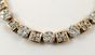 Bracelet 2 ors 585 mil. alternant des maillons ronds et carrés pavés de diamants brillantés, avec chainette et huit de sécurité. (Egrisures, fermoir accidenté). (Longueur : 19,5 cm environ). 20,3 g. brut.