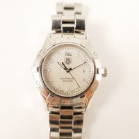 Bracelet-montre de dame TAG HEUER « Aquaracer » en acier, boîtier rond, lunette tournante graduée, cadran nacré, index diamantés, guichet dateur à 3H, mouvement à quartz, bracelet et boucle déployante signée en acier, signé et numéroté (diamètre : 28 mm environ) (longueur : 15 cm).
