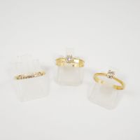 Trois bagues en or 750 mil. dont deux solitaires (diamants brillantés de 0,25 et 0,12 carat environ) (TDD : 53) (déformation) et une rivière (diamants brillantés) (TDD : 52). 5,4 g. brut