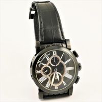 (*) Montre-bracelet d’homme DUBEY & SCHALDENBRAND « Grand Shar DB Full Black» en acier noirci. Boitier rond (diamètre 44 mm environ), lunette céramique noire. Cadran noir à grands chiffres romains peints, guichet dateur à 3h30, trotteuse centrale, 3 compteurs secondaires, réserve de marche 48h. Mouvement mécanique faisant chronographe à remontage automatique. Fond squelette vissé. Bracelet cuir, boucle ardillon acier noirci siglé. Signée et numérotée LTD N°04/16. Sans écrin, ni papiers.