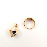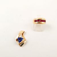 Bague en or 750 mil. sertie d’une ligne de rubis. TDD : 48,5. 4,9 g. brut. + Pendentif en or 585 mil. (pierre imitation, diamants brillantés). Hauteur : 2, 2 cm environ. 3,9 g. brut. Poids total brut : 8,7 g. brut.