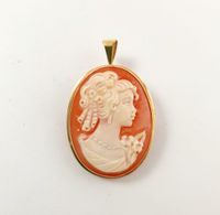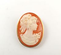 Broche pouvant former pendentif en or 750 mil. ornée d’un camée coquille à décor d’un profil féminin. Hauteur : 3 cm environ. 4,6 g. brut.