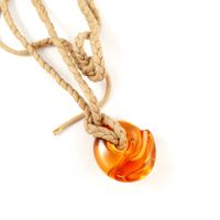 Pendentif BACCARAT en cristal orangé transparent pressé-moulé, signé en lettres cursives à la pointe, sur un cordon tressé. Hauteur : 4,8 cm environ.