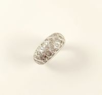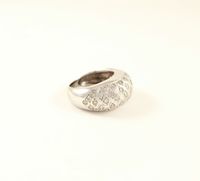 Bague jonc bombée en or gris 750 mil à motifs de croisillons ciselés rehaussés de diamants taille brillant. (TDD : 50). (Largeur : 1cm environ). (Fissures à l’or, manque de matière à un diamant). 6,1 g. brut