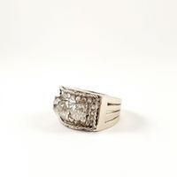 Bague Tank en or gris 750 mil à pans coupés centrée de 3 diamants taille ancienne de 0.50 carat environ chaque, dans un entourage de diamants taillés en roses et or torsadé, épaulement ajouré. (TDD : 49,5). (Une rose manquante, trace de mise à taille, serti à revoir). 11 g. brut