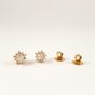 Paire de boutons d’oreilles en or 750 mil centrés d’un diamant taille brillant de 0.20 carat environ, dans un entourage rayonnant de diamants tailles brillant et baguette. Systèmes pour oreilles percées à vis. 3,4 g. brut