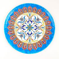 Manufacture HAUTIN-BOULENGER, CHOISY-LE-ROI, Plat rond en faïence et émaux polychrome à décor floral sur fond turquoise. Marque en dessous « Granit Médaille d’or HB Choisy-Le-Roi ». Fin XIX ème – Début XX ème. Diamètre : 31,5 cm. (Légères égrenures).
