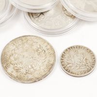 2 pièces : une de 50 frcs en argent 900 mil et une de 2 frcs en argent 835 mil. 40 g. On y joint 7 pièces commémoratives en nickel : 2 Semeuse, 1 Tour Eiffel, 2 Europe des XXVII, 1 de Jean-Paul II et 1 de Louis XIV.