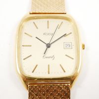 Bracelet-montre d'homme en or 750 mil, boîtier rectangulaire arrondi (Dim : 31 x 32 mm environ), cadran beige à index bâton et guichet dateur, tour de bras en or 750 mil tressé, guilloché (Long : 18,5 cm environ), KODY, mouvement quartz. 73 g brut.