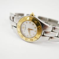 Bracelet-montre BAUME & MERCIER « Linéa » en acier et métal doré, boîtier rond, lunette gravée de chiffres arabes, cadran nacré, index diamantés, mouvement à quartz, bracelet et boucle déployante signée papillon en acier, signé et numéroté (diamètre : 24 mm) (longueur : 17,5 cm environ) (légères usures).