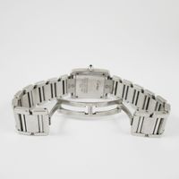 Bracelet-montre de dame CARTIER « Tank Française » en acier, petit modèle, boîtier rectangulaire cadran crème, chiffres romains peints, mouvement à quartz, bracelet et boucle déployante papillon signée en acier, signé et numéroté (dimensions : 25 x 20 mm) (longueur : 14,5 cm environ).