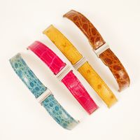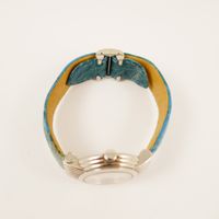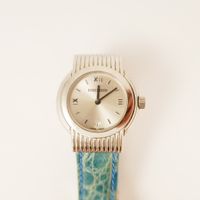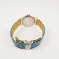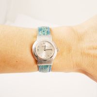 Montre-bracelet de dame BOUCHERON « Reflet Solis » en acier, boîtier rond, lunette godronnée, cadran argenté rayonnant à chiffres arabes et index bâton appliqués, guichet dateur à 6H, mouvement à quartz, bracelet en cuir turquoise avec boucle invisible coulissante, accompagnée de trois bracelet interchangeables en cuir ocre, fuchsia et marron (diamètre : 27 mm environ) (longueur : 16 cm environ) (légères rayures d’usage).