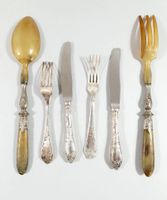 CHRISTOFLE, fin XIXe-début du XXe siècle : suite de 12 fourchettes à escargots en métal argenté, modèle à fleuron, filet et coquille en spatule chiffrée MP. Signées. Poinçon de Maître 1865-1935. L. 15 cm.L’originalité de ces fourchettes à 2 longues dents est à souligner + lot en métal argenté : 1 couvert à salade rocaille manches corne accidenté, 6 petits couteaux et 6 fourchettes à entremets rocaille travail russe moderne, 2 grandes fourchettes baguette. Rayures.