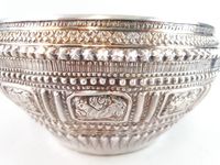 Grande coupe libatoire en argent repoussé à fond plat et richement décorée en frise sur le corps de 12 petits cartouches figurant les 12 signes du zodiaque - le Rat, le Buffle d'eau, le Tigre, le Chat, le Dragon, le Serpent, le Cheval, la Chèvre, le Singe, le Coq, le Chien et le Cochon - sur un décor de lotus, feuillages et perles avec éléphants dans le fond. Travail d'Asie du Sud-Est du XXe siècle. Cygne français. Hauteur: 12 cm. Diam. 22 cm. Poids: 482.1 g. Quelques courbures et déformations.