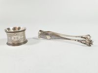 Lot en argent 950 mil. du XIXe siècle (poids total : 69.2 g) :-VEUVE LEONTINE COMPERE (active 1888-1919) : pince à sucre en argent 950 mil. modèle guilloché et pastillé à pieds griffe patte de lion. Cartouche non chiffré. Minerve 1er titre de 1838 et poinçon de Maître de la Veuve d’Ernest Compère. Poids : 44.4 g. H. 14.4 cm. TBE.-PHILIPPE BERTHIER (actif 1841-1851) : rond de de serviette en argent 950 mil. à décor guilloché et ciselé, cartouche chiffré IC en lettres gothiques. Minerve 1er titre de 1838 et poinçon de Maître. Poids : 24.8 g. H. 3.6 cm. Diam. 5.2 cm. TBE.