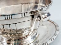 ORBRILLE, Années 1930-1940 : saucière nacelle en métal argenté, modèle à plateau ovale anciennement amovible. Décor lisse alterné de filets et bandeaux de petits godrons. Les anses à rouleaux. Poinçon de Maître et de grammage d’argenture. L. du plateau : 23 cm. Dim de la saucière : 16.9 x 15.5 cm. Rayures d’usage interne.