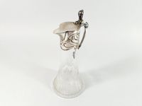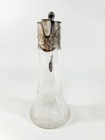 WMF, époque ART NOUVEAU, Allemagne : carafe à décanter en cristal gravé de forme incurvée à fond plat décor de croisillons, languettes et feuillages, la monture du col et l’anse en métal argenté à décor de lianes végétales. Micro-rayures, rayures plus visibles sous le fond. Signée. H. 30.3 cm.