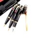 Mini stylo bille WATERMAN ‘S FLAIR en or 750 mil (8,8 cm)(poussoir du stylo défectueux), avec étui en cuir (11,9 g brut). Parure de 3 stylos MONTBLANC Bohème en résine noire, métal doré, et pierres imitation comprenant un porte-mine, un stylo-bille et un stylo-plume avec plume rétractable (plume en or 585 exemptée : art. 524 bis du CGI al. C) (24,3 g brut), avec étui en cuir noir MONTBLANC.