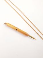 Pendentif en or 750 mil guilloché dissimulant une petite lame rétractable (hauteur total avec bélière : 5,5 cm) (déformations), avec collier à maillons gourmette avec chaînette de sécurité (longueur : 62 cm). 12,5 g brut.