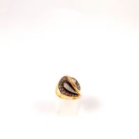 Bague dôme en or jaune, or gris et or noirci 750 mil à motifs floraux stylisés affrontés pavés de diamants taille brillant, blancs et bruns. (TDD : 60). 12,5 g. brut