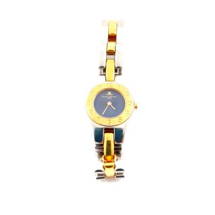 80 / 120 €Bracelet-montre de dame BAUME et MERCIER « Linéa » en acier et métal doré, petit boîtier rond, lunette graduée, cadran bleu nuit muet, mouvement à quartz, avec bracelet et boucle déployante en acier et métal doré. Signé et numéroté. (Dorure usée). (Tour de bras: 15,5 cm environ, diamètre : 21 mm).