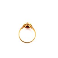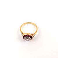 Bague en or 750 mil. et platine 850 mil. à chaton rond centré d’un diamant TA (0,50 carat environ) dans un entourage de rubis trapezoïdales, épaulés de roses. (Egrisures). (TDD : 50). 2,5 g. brut.