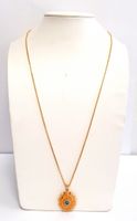 Collier en or 750 mil. (Longueur : 69 cm). Pendentif médaillon ovale 2 ors750 mil. serti d’un cabochon de turquoise (Hauteur : 4,2 cm). (Traces de colle au niveau de la turquoise). 17,7 g. brut.