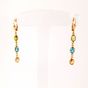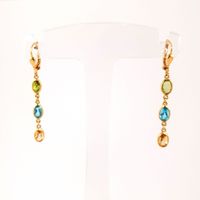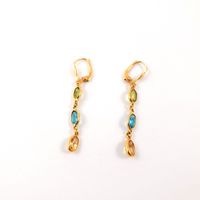 Paire de pendants d’oreilles en or 750 mil. sertis de peridots, citrines et pierres imitation bleues de taille ovale. (Longueur : 4,4 cm). 2,6 g. brut.
