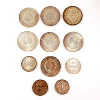 Lot de 11 pièces de monnaie en argent : dont 10 pi