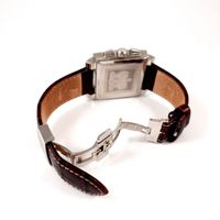 Montre-bracelet d’homme chronographe HAMILTON « JazzMaster Square » en acier, boîtier carré, cadran noir à index et chiffres arabes à 2 compteurs secondaires et guichet dateur à 4H30, mouvement automatique, sur bracelet en cuir à double boucle déployante siglée. Signée et numérotée. (Dimensions boîtier : 40 x 40 mm). (Tour de poignet : 17,5 cm).