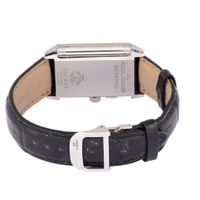 (*) JAEGER LECOULTRE, Reverso, Duo Face. Montre d’homme rectangulaire en acier. Boîtier réversible avec double face. Recto : cadran argenté avec chiffres arabes, petite trotteuse et minuterie chemin de fer. Verso : cadran noir avec aiguilles luminescentes, chiffres arabes et index bâtons, cadran auxiliaire 24 heures pour le mode jour/nuit. Mouvement mécanique à remontage manuel. Bracelet en cuir avec fermoir déployant en acier signé. Dimensions : 26 x 42 mm. Référence : 272 8 51. N° de série : 2787270. Écrin et surboîte, carte de garantie du 8 avril 2012, livret et chiffon, carte du vendeur dans la boutique.
