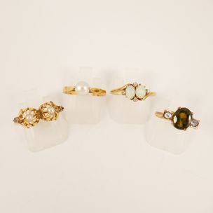 Lot de quatre bagues : une en or 750 mil. et platine 850 mil. (semence de perle et roses) (TDD : 54) (3,2 g. brut) ; une en or 750 mil. (perle de culture) (TDD : 52,5) (2,5 g. brut) ; une en or 585 mil. (opales et diamants TA) (TDD : 57) (1,8 g. brut) ; et une en or 375 mil. (zircon vert et pierres fines bleues) (TDD : 52) (égrisures, éclats) (1,9 g. brut). Poids total : 9,4 g. brut