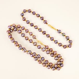 100 / 150 €Demi-parure composée d'un collier et d'un bracelet de perles de culture grises, fermoirs et perles intermédiaires en or 750 mil. (longueurs : 41 et 19 cm environ) (diamètres perles : entre 5,5 et 6 mm) (fermoirs déformés). 21 g. brut