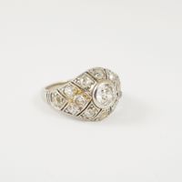 Bague dôme en platine 850 mil. à décor ajouré et géométrique, sertie de diamants TA dont un central de 0,30 carat (un petit diamant brillanté) (TDD : 43-44) (traces de réparations). 4,4 g. brut