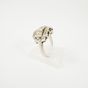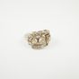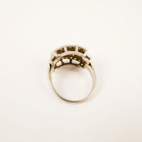 Bague en platine 850 mil. à décor géométrique ajouré, sertie de trois diamants TA de 0,15 carat environ et de diamants 8/8 (TDD : 48) (monture accidentée et déformée, éclat, manque diamant, trace de soudure). 5,7 g. brut