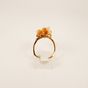 Bague marquise moderniste en or rose 750 mil. à décor géométrique ornée de boules de corail et de diamants brillantés (TDD : 56) (longueur : 3,4 cm environ) (traces de colle). 8,6 g. brut