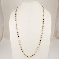 Lot en or 750 mil. composé d’un collier de deux rangs alterné de rubis et de saphirs verts et bleus (longueur : 68 cm environ) (deux accidents), et de quatre bagues (pierres imitation rose, pierre fine orange, émeraude) (TDD : 60-56-54) (égrisures). 20,5 g. brut