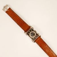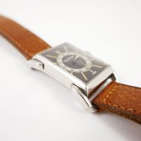 Montre-bracelet JAEGER LECOULTRE, Uniplan étrier, en acier, boîtier rectangulaire numéroté 32148, cadran noir, chemin de fer au centre, index bâton peints, mouvement mécanique numéroté 76929, calibre 55/9L, bracelet en cuir brun, boucle ardillon d’origine en acier (cadran et mouvement signés) (dimensions : 36 x 23 mm environ) (usures au cadran et aux aiguilles).