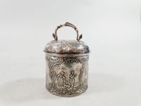 KARL KURZ, Allemagne, vers 1880 : Boîte droite ronde en argent 800 mil. en forme de boite à thé, le couvercle en petit dôme et prise mobile au petit dauphin et becs de canard. Décor de cartouches de rinceaux feuillagés à 3 scènes champêtres bucoliques différentes. Poinçons allemands post 1886 et d’orfèvre kkk. Charançons français de 1864 et de 1893. Poids : 121.1 g. H. 7 cm (avec l’anse mobile : 9.7 cm). Diam. 7 cm. TBE.