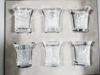 LALIQUE FRANCE d’après RENE LALIQUE (1860-1945), Production contemporaine : suite de 6 verres à liqueur « ENFANTS » de forme tulipe en cristal blanc moulé-pressé à décor d’un enfant en léger relief satiné encadré de grappes de raisin. Signés à la pointe en lettres cursives Lalique ® France sous la base. H. 4.5 cm. TBE.Boîte Lalique Paris d’origine (avec notice de contrôle)Bibliographie : Félix Marcilhac, Catalogue Raisonné, Section « Gobelets », N° 3418. Modèle crée en 1932 par René LALIQUE. 134 euros neuf la pièce au catalogue en ligne.