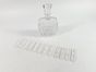 Lot en cristal, XXe siècle :- suite de 12 porte-couteaux des années 1960, moulés de forme ondulée et rectangulaire, le fond à décor de croisillons. L. 9 cm. H. 1.9 cm. Quelques petits éclats aux bases. TBE général de fraicheur. Boite accidentée. - Carafe à whisky ovale en décor taillé et moulé de pointes de diamant, pastilles ovales et pans. Le bouchon en navette triangle numéroté 72. H. 23.5 cm. L. à la base : 12.7 cm. Micro-rayures.