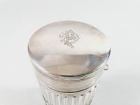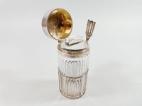 LOUIS COIGNET ET ERNEST CARDEILHAC, FIN XIXe siècle : Porte-condiments ou pot à cornichons de forme ronde en cristal taillé de cannelures avec son grand couvercle interne en cristal, la monture et le couvercle en argent 950 mil., la galerie ajourée, le col mouluré et fileté, le couvercle à charnière. Pique latérale en argent amovible en forme de flèche. Monogramme BP. La monture du corps est de la maison COIGNET (actif 1889-1893), la pique de la maison E. CARDEILHAC (actif 1851-1904). Minerve 1er titre et poinçons de Maître.Poids brut total : 651.5 g. Poids de la pique seule : 18.8 g. L. 18.7 cm. Dimensions du porte-condiments : H. 16.4 cm. Diam. 7.5 cm. H. avec la pique 18.7 cm. Petites égrisures sur le corps du cristal. TBE de l’ensemble.