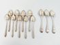 PIERRE-DESIRE RAYNAUD, SECOND EMPIRE : Suite de 3 cuillers à café en argent 950 mil. modèle baguette à médaillon jarretière chiffré AR et agrafe lambrequin. Minerve 1er titre de 1838 et poinçon de Maître (insculpation en 1864 à Paris). Poids : 54.3 g. L. 14.5 cm. Légères rayures.+ suite de 9 cuillers à café en métal argenté de la maison des Magasins du Louvre de la fin du XIXe siècle, la tige dite à la russe à pans. Poinçon au lion couché L. 13.4 cm. Légères rayures.